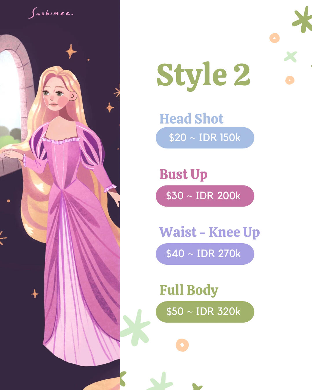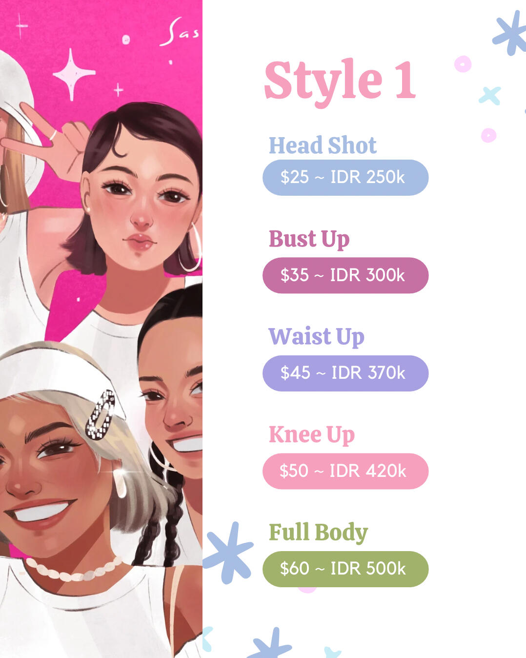 1. All the prices in the picture are for one portrait and personal use. All prices in the table are commercial use prices.2. I can work with description but visual references are always appreciated!3. If you have any visual reference please let me know ahead before I start doing sketches to avoid big changes.4. Any big changes due to inconsistent brief (reference/description) can be charged depending on how much and how big the change is.5. All revision for shape, pose, features, etc is done at sketch, I won't be able to change much once the colors are applied.6. You may use, print, and post your commission as much as you like as long as it's for personal use and DON'T claim to do the artwork yourself.7. characters are done in MY STYLE, please do not ask me to draw realistically or mimic another artist's style/artwork.8. You can pay up front or make a 40% down payment, I will start sketching after I recieve the payment!9. Each commissions are eligible for around 4 revisions. I'm not as strict about revision as long as it's reasonable.10. I won't accept any revision after the payment is fully paid and the file is well recieved. Any additional revision will be charged start from $20 / Rp 200k11. For bigger projects, payment method can be discussed.