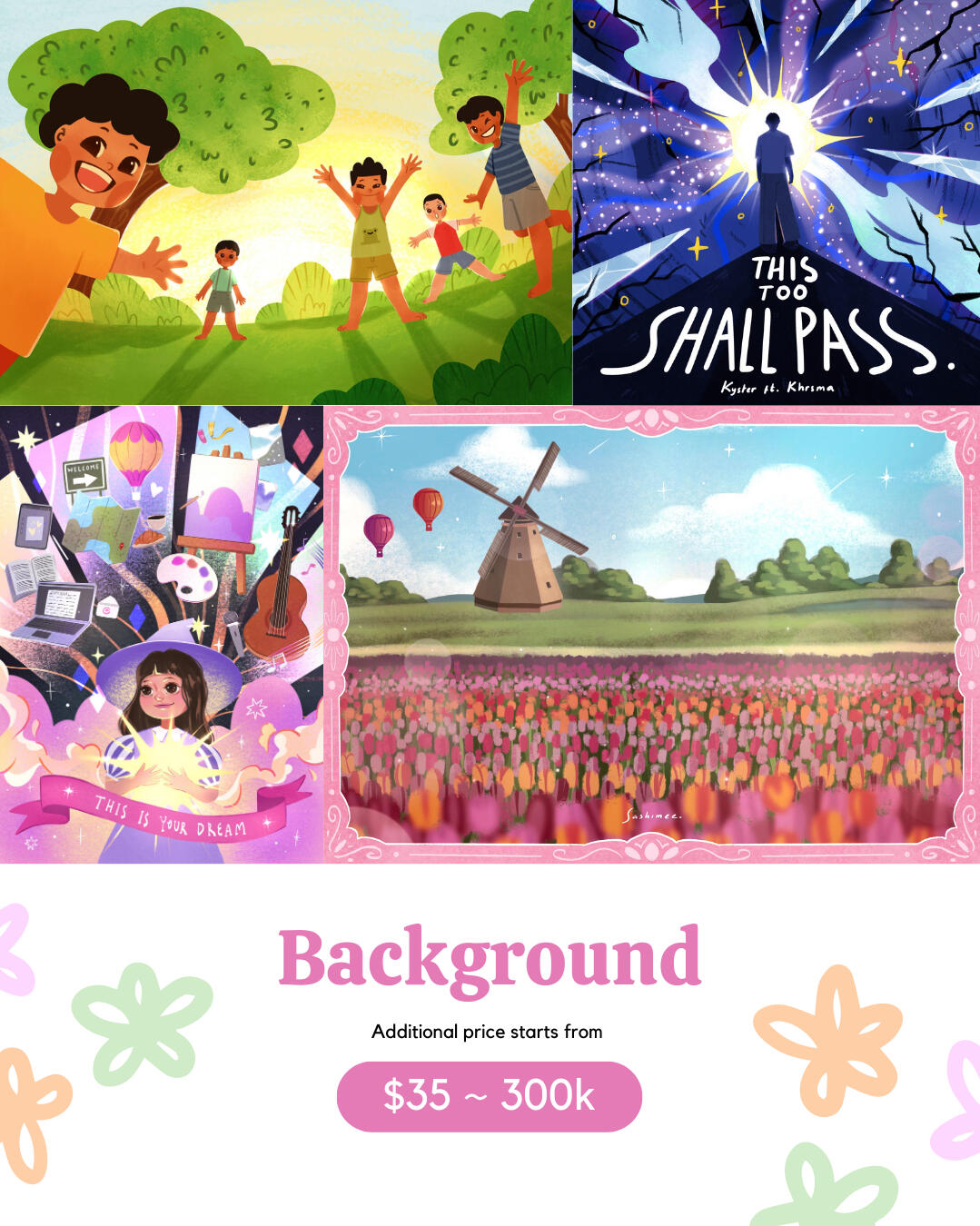 1. custom commissions (outside from the commission sheet) are generally more expensive.2. I can give discount for multiple people in one portrait.3. I'm open for other request outside of portrait such as logo, branding, banner, sticker design, etc.4. each artwork is done in a range of a week to a month due to many factors, so please stay connected!5.All prices already including simple decoration for 3-5 items (eg : books, food, flowers, work item, school item, personal related item, etc)6. I accept NSFW and furry request